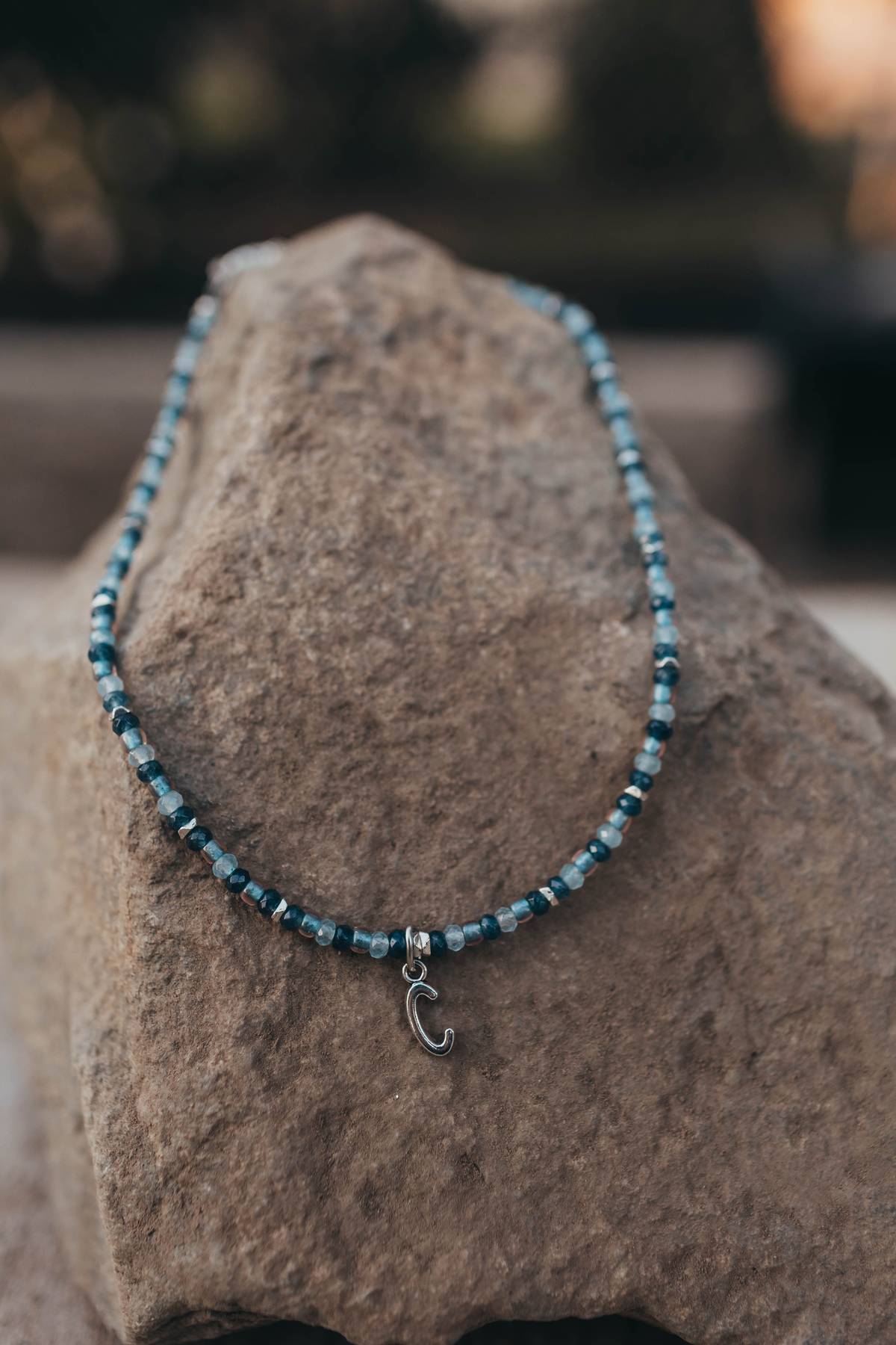 Faceted blue stones, glass and silver tone accents with your choice of letter charm