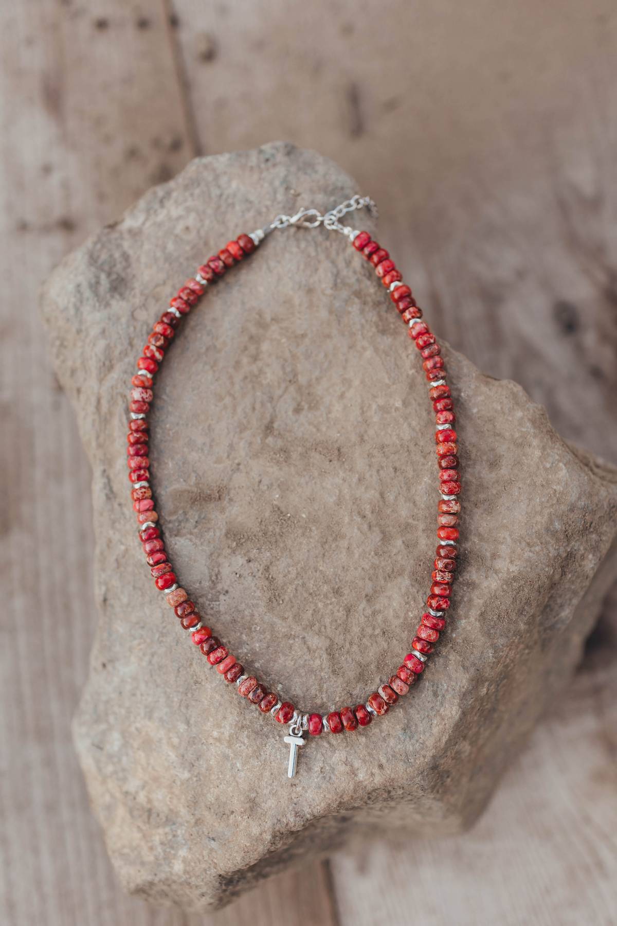 Red Jasper, glass and metal accent beads with gold tone letter of your choice