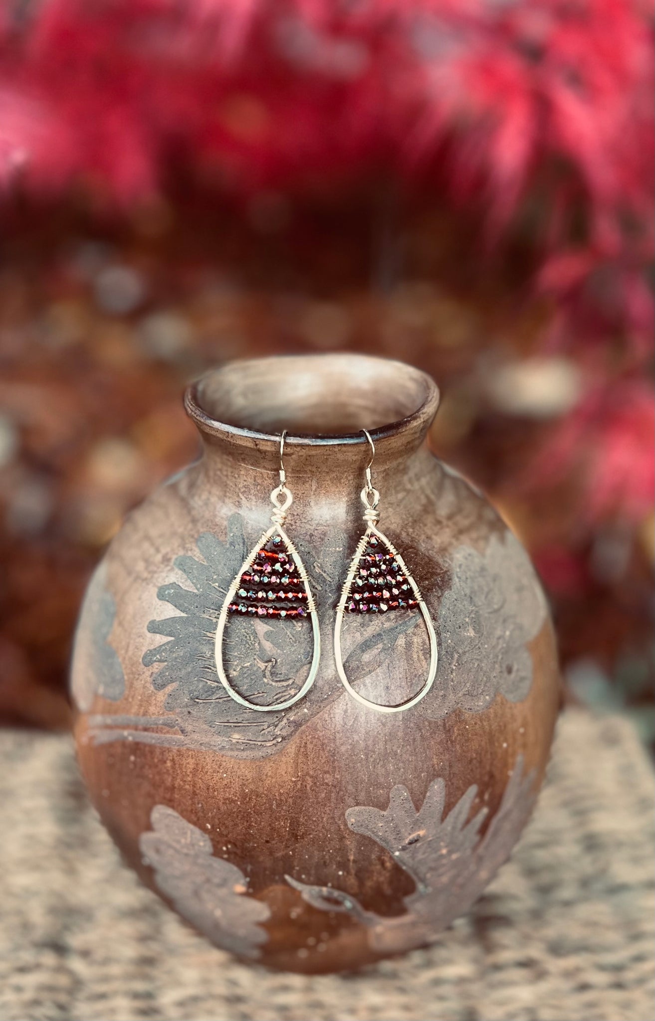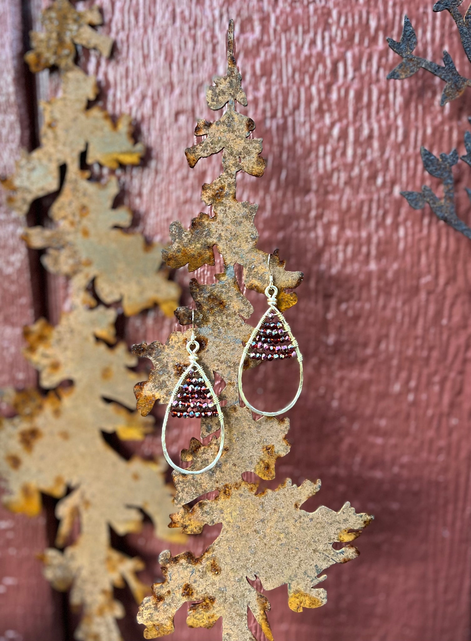 Iridescent cranberry colored Chinese Crystals are wire wrapped into a hand crafted tear drop hoop