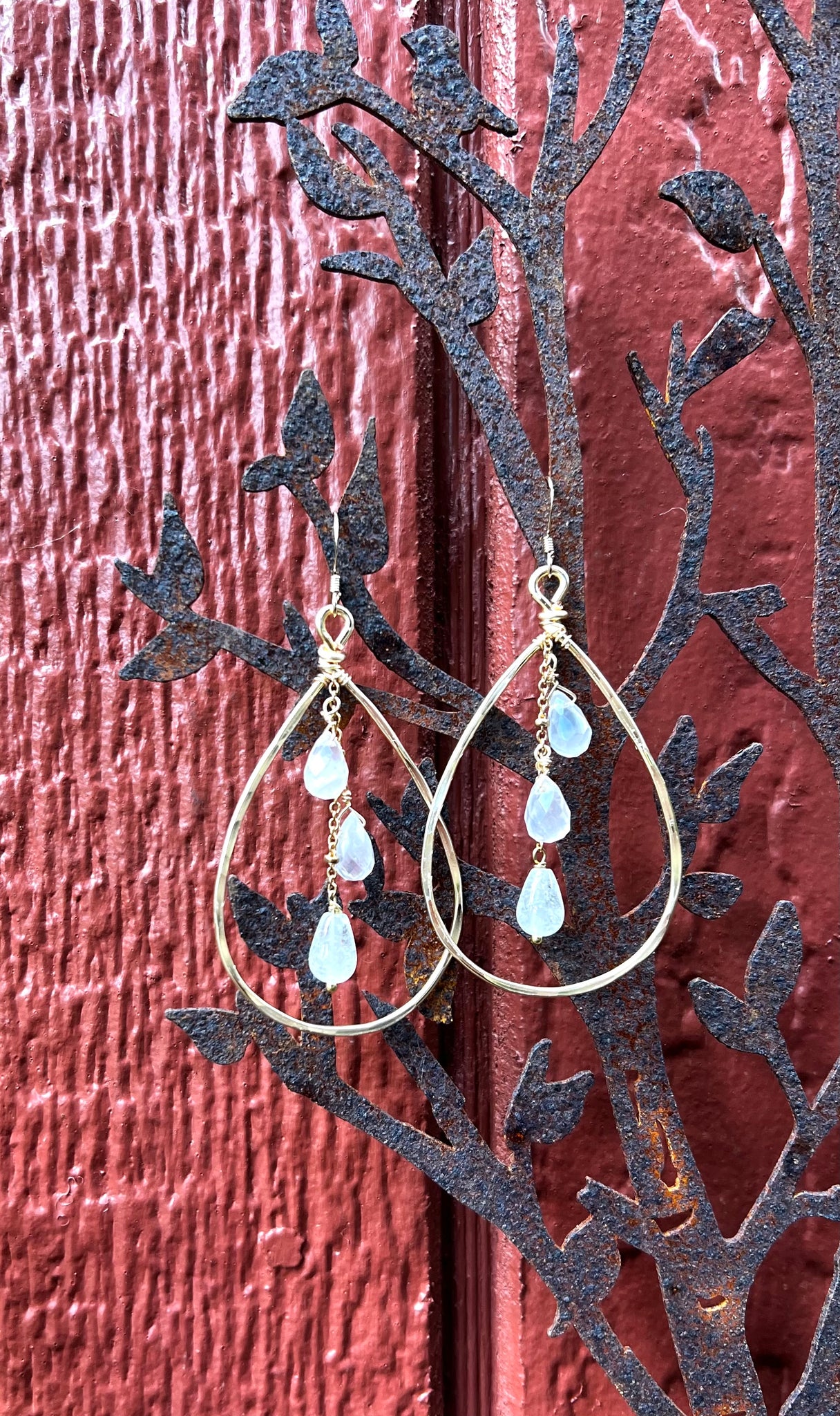 Crystal tear drops on gold tone chain are wire wrapped into hand crafted hoops