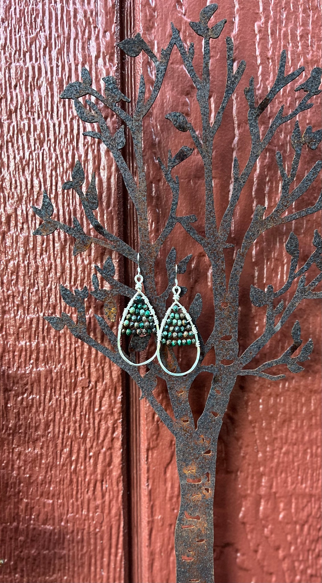 Faceted turquoise stone beads are wire wrapped into hand crafted tear drop hoops in gold or silver tone